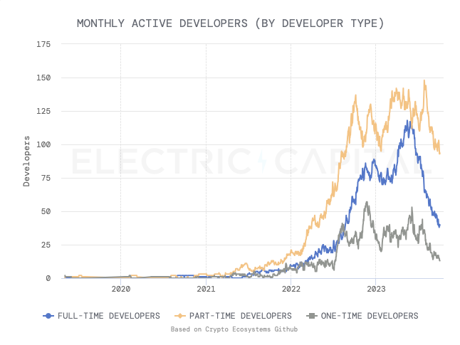 Sui’s main net is launched in May 2023, after 1 year of testing. Significantly, the number of developers dropped by 3 times after the main net launch. As of 1 October 2023, there are 146 monthly active developers.